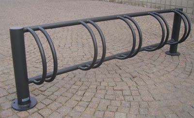 Profilati in tubolare di acciaio Ø 30x1,5 mm., opportunamente curvati, e rigidamente saldati a due tubolari orizzontali in acciaio Ø 40x2 mm. Lateralmente il portabiciclette è sostenuto da due montanti verticali in acciaio Ø 90x2 mm. muniti di idonee piastre base circolari per il fissaggio a terra a mezzo di tasselli.